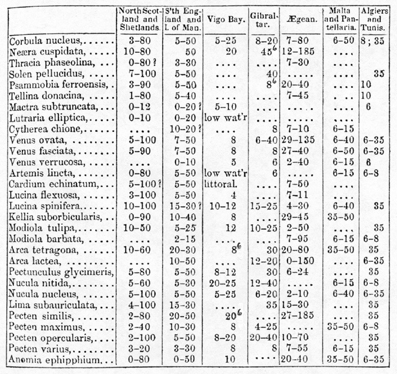 10 fathoms, seldom below 74° in the summer. The temperature of the waters near Southern England in summer is 62°; and near the Shetlands 55° or less. Consequently the surface summer temperature of the British Channel is not found in the Ægean at a less depth than 35 fathoms, and the surface summer temperature of the Shetland's is the temperature at one to three hundred fathoms in the Ægean; and still species that range to a depth of 100 fathoms about northern Scotland are found within 30 fathoms of the surface in the Ægean, that is where the summer temperature is 74° or more. Such facts show the hardiness of the species in enduring great ranges in temperature. We must therefore conclude that it is not temperature [[p. 207]] alone or mainly which determines the depth to which species may live. It exerts an influence, and species fitted for cold waters may be found in the deeper seas where such waters occur. But the limit of descent depends on other influences. Looking at this table in another way, we see, as recognized by Prof. Forbes, that species which occur at or near the surface in Northern Scotland, are generally met with only at greater depths in the Mediterranean; that is, the minimum depth is less in the former case than the latter. Thus Corbula nucleus has for its minimum depth in the Mediterranean six fathoms, and in the northern regions three fathoms. Psammobia ferroensis has ten fathoms for the former, and three for the latter. Other examples will be found in the above table, sufficient to illustrate the principle although many exceptions exist. Thus species that have a range of 100 fathoms beyond Scotland may have the same in the Mediterranean, except that in many cases they do not reach as near the surface, where the waters are warm. The Crustacea of the same seas illustrate this subject in a similar way. But the observations upon them have been made with less thoroughness and we have therefore confined our discussions to Mollusks. _________________________
