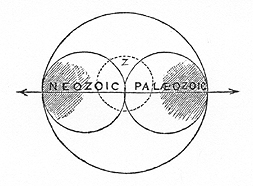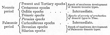 The earnest desire implanted instinctively in every enquiring mind, to discover a law or scheme in arrangements of Nature, has given origin to many speculations concerning the distribution of life in geological time, all of them founded on facts more or less clearly [[p. 429]] understood. Hence have arisen the hypothesis of an evolution of all organized types, during the course of time, from one rudimentary prototype; that of the succession of distinctly originating forms of animals and vegetables in order of the progression within their respective series; of the coeval starting of the great groups wholly or mostly at the beginning, but in each instance by the lower forms of the type; of the representation by the faunas and floras of geological epochs, of the successive zones of life belting the geographical regions between the poles and the equator; of an uniformity of life arrangements throughout time and repetition through substitution of equal and similar groups; and of manifestations in the distribution of life in time of analogies that are essentially theological. For several years I have been persuaded that the simple and unquestionable phenomena of substitution of groups by representative groups, manifested in the arrangements of the faunas and floras of all geological epochs, and comparable with like phenomena exhibited by the geographical distribution of existing organized beings, would prove sufficient for the explanation of all the appearances, that have suggested such speculations, some purely hypothetical, some fairly theoretical, as those I have just indicated. The apparent contradictions and unexplained peculiarities presented by the more ancient epochs as contrasted with the middle and newer ones, seemed to depend on the incomplete state of our knowledge, and to be possibly explainable by supposing, that of some great geological epochs in time we had as yet discovered no traces. Thus the great gap between the Palæozoic and Mesozoic life might depend upon our not yet having discovered traces of the rudimentary formations that had been deposited during the interval between the Permian and Triassic epochs. But the rapid accumulation of palæontological facts gathered within the last very few years, and the great additions that have been recently made towards our knowledge of the Palæozoic fauna, all mainly in accordance with facts known before, have satisfied me that the explanation offered above does not sufficiently meet the full truth, and that the various theories concerning progression, development, &c. have all originated in the obscure perception and imperfect interpretation of the workings of some great law in the distribution of organic beings in time. It is no longer possible, in the face of palæontological evidence, to hold any of the notions cited. The scale of the first appearance of groups of beings of any degree is most clearly not one of organic progression. Suitable conditions have been met by the creation of suitable types; no type, whether generic and therefore ideally manifested, or specific and therefore manifested actually and through individuals, visibly, being found to be ever repeated in time, when the full history of either is made out. This is a great law and a grand result of geological research. Nevertheless in the relative arrangements, so to speak, of generic types in time, there is an [[p. 430]] indication of the working of a general law of another kind, and one, which seems to me to depend on the manifestation of the relation of Polarity. We are accustomed to group all geological epochs under three great sections, the Palæozoic, or oldest, the Mesozoic or middle, and Cainozoic, more commonly termed Tertiary, or newest. If we consider the faunas (and floras) of these three great sections, we cannot but perceive that there is a far stronger affinity between the Mesozoic and Tertiary epochs than between the Mesozoic and Palæozoic. This is especially manifest when we regard the details of the distribution of those preservable forms of animal life, which being inhabitants of the medium in which sedimentary strata are deposited, are most likely to afford an approach towards complete evidence. On the other hand, the forms of life that characterize the Palæozoic formations, the products of a vast succession of time-periods, have, when regarded in their totality, a wonderful agreement and relationship among themselves. For this reason I propose to denominate the sum of the epochs after the Palæozoic, by the name of Neozoic. Now if we regard these two great periods separately, we find that the manifestation of generic types during each exhibits striking and contrasting phenomena. The maximum development of generic types during the Palæozoic period was during its earlier epochs; that during the Neozoic period towards its later epochs. And thus, during the Palæozoic period, the sum of generic types and concentration of characteristic forms is to be observed in Silurian and Devonian formations; during the Neozoic period it is during the Cretaceous, Tertiary, and present (itself part of the Tertiary) epochs that we find the maximum development of peculiar generic types (or ideas). On the other hand, during the closing epochs of the Palæozoic and the commencing epoch of the Neozoic period there was a poverty in the production of generic ideas, with few exceptions the species of the epochs in question being members of genera that form constituents in the assemblage, accumulated during the epochs of maximum of generic types or ideas. The following table may render my meaning more evident: