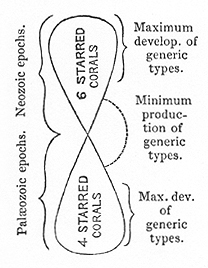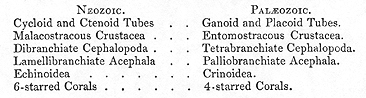 Before the Silurian and after the commencement of the present, no special creations of generic types have as yet been shewn to be manifested. In the system of life of which all known creatures [[p. 431]] living or extinct as yet described, so far as our knowledge extends--and there is a consistency in its co-ordination that suggests the probability of our being acquainted with its extremes,--the creation of the fauna and flora of the oldest Palæozoic epoch would seem to be the primordial and the appearance of man the closing biological events. When the assemblage of characteristic Neozoic groups or genera is contrasted with that of the Palæozoic, there we find that the concentration of a maximum development of generic types towards the earlier stages of the one and the later of the other great period, includes something more than a mere numerical profusion of generic ideas. The two great manifestations of creative intensity are in opposition, or contrast, and respectively substitute each other; groups that are parallel within their sub-kingdoms or classes taking the place of each other and playing a corresponding part in the economy of nature. This replacement does not depend on the substitution of a group of higher organization during the latter epoch, for one of lower during the former. Where there is such a substitution it must be regarded as an accident; for the rule is not general nor can it be held good except for a few instances. A few leading examples of the substitution of group for group during the contrasting epochs are cited in the following table and will illustrate this point better than a mere abstract statement.