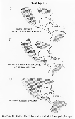 1. Evolution of Middle America. We have seen in the review of the Amphibian and Reptilian fauna of Mexico that it is composed of Northern and Southern immigrants; that a considerable number of the northern group can claim to be old, autochthonous Nearctics; that some families, genera, or species have also representatives in the Antilles, and that most of these forms point unmistakably to Central America, or even further south, as their original home; lastly, that but few Antilleans belong to a northern stock. The explanation lies in the geological history of this part of the world. I restrict myself on purpose to this part, lest such an inquiry should lead to a discussion of the whole globe since the first dawn of Amphibian life in some Palæozoic country. Our present task limits itself to the Tertiary period. It is doubtful whether any of the genera in question are older than the Eocene, but not a few can be proved to have existed in our region in the mid-Miocene epoch; and it is surprising that they should date so far back. Lastly, there was no Central America in the Cretaceous period. The building up of Mexico and neighbouring countries seems to have taken place as follows, so far as I can gather from the writings of A. Agassiz, Suess, Lapparent, R. T. Hill, J. W. Spencer, J. W. Gregory, C. Sapper, and José G. Aguilera1. The accompanying consecutive series of maps illustrate my abstract conclusions, and only in this abstracted sense can claim originality. Mexico came into existence during the Lower Cretaceous epoch. To a nucleus of land, Sierra Nevada and California, were added the Rocky Mountains and the bulk of the Mexican Plateau. This large complex I call the Old Sonoraland. It is important to remember that it was separated, during the Upper Cretaceous epoch, by a broad belt of sea from the eastern and northern parts of North America. A third mass of land existed as Brazilialand. In the meantime appeared Antillean lands, and, possibly in sympathy with the east to west trending mountains of Honduras [[p. 235]] and Guatemala, also the Mexican Sierra Madre del Sur. These parts were in time annexed by Sonoraland. By the late Eocene, conditions were so far consolidated that there existed the present North American Continent, eastern and