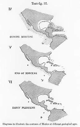 results:--Establishment of the continuity of North and Central with South America, and a continuous mass of land from Central America, north and eastwards, comprising the Greater Antilles and the southern end of Florida. For this Central Land (Antilles + Central America proper, and adjoining parts of South [[p. 237]] America, viz. Colombia and Venezuela) I use the name of Great Antillia, the term Antillia having already been used by others. The present Gulf of Mexico remained below the sea, and was larger than it is now, covering the Atlantic Tierra Caliente of Mexico, Yucatan, and, according to Hill, the main part of Florida. If correct, the latter point is important. It seems also probable that the Mexican-Central American land, during the Miocene epoch, extended considerably further westwards than the present Pacific coast, taking in with almost certainty the Revilla Gigedo Islands. Late Miocene, or early Pliocene, comprise a time of subsidence, resulting in the present features. Severance of the Antilles into the present islands, which since have undergone comparatively unimportant changes of shape and extent; separation of Florida. Lower California became a peninsula, owing to the formation of the Gulf of California. The Revilla Gigedo Islands, still later the Tres Marias, are remnants of the subsiding land. Yucatan appears at the beginning of the Pliocene epoch2. The Isthmus of Panama is limited to its present narrow dimensions. A few words remain to be said about the volcanic activity and other changes affecting the configuration of the Mexican Plateau. A tremendous dislocation, at the latest in Eocene times, produced the Eastern Sierra Madre, composed entirely of Cretaceous limestones, raised up high, forming the elevated eastern rim of the plateau, and falling off abruptly towards the Atlantic lowlands. In the Eocene epoch began also the enormous outburst of volcanism, raising the Western Sierra Madre, piling up gigantic masses of igneous rocks, mostly andesite, and lavas, which continued to spread over a vast part of the country during most of the Miocene epoch, and, more locally, even in historic times. Most of the plateau is now covered with the Quaternary debris, sand, &c., which overlie the eruptive masses and the older calcareous or limestone formations. These accumulations of more or less sandy soil form plains, mostly treeless. They are of great extent, in the northern half, from Texas to Zacatecas. In the middle, say from Guadalajara to Puebla, exist a great number of smaller plains or "valles," that is to say fertile plains, interrupted or partly surrounded by the outcropping hills of volcanic formation, and they contain a fair number of lakes. In the south of Mexico, in the States of Oaxaca and Guerrero, such plains are rare or absent. Trees are scarce or absent on the plateau; it is an idle fable that it was well-wooded in historic times. The bordering high Sierras and their slopes are well-wooded, densest on the moist, Atlantic side. The eastern, southern, and western Tierra Caliente is covered with luxurious growth, either forming continuous forests or showing the features of savannahs. The plateau is dry, verging towards prolonged droughts, interrupted by few, occasionally torrential, rains. The Atlantic [[p. 238]] hot-lands and the eastern slopes of the States of Vera Cruz and Chiapas are very wet, with a very long and abundant rainy season, interrupted by a short dry time in the winter. The Pacific side is much drier; the actual amount of annual rainfall is considerably less and the dry winter period is much longer. The plateau rises from less than 1000 feet near Laredo, and 3800 at El Paso, gradually to about 6000 at Aguas Calientes and Querétaro, and above 7000 at Mexico City and Puebla. The highest masses of mountains, bordering the plateau, lie in the south-east, south and west, culminating in the snow-capped peaks of Citlaltepetl or Volcan de Orizaba, Popocatepetl, Nevado de Toluca, and Nevado de Colima. 2. Immigration and Spreading. Obviously these physical conditions influence the fauna now; what they were like in bygone ages we can only surmise. Ranges of mountains are by no means always barriers; on the contrary, they help the dispersal along the lines of their long axes. Regions covered by the sea are of course not available. The same applies to districts which are subject to volcanic eruptions. This is very important for Mexico. Not only the Western Sierra Madre with its continuations to Colima and thence towards Puebla, but also almost the whole of the plateau became covered with eruptive masses, and, considering the immense extent of this terrain, a long time must have elapsed before it became available for plants and animals. We may well ask, what remained of the country as suitable for life. Of course, probably, there were archaic tracts standing out, not affected by these revolutions, but these gneisses, schists, and granites form scattered enclaves. I think it was the Pacific strip--Sonora, Sinaloa, Tepic, and part of Jalisco--which was not affected; in fact, the Pacific slopes, together with the land which has since sunk below the Gulf of California. On the eastern side, part of the plateau did not suffer from eruptions, but the land was still narrowed; there was no Atlantic lowland, this being during the whole Miocene epoch, and even later, still below the sea. Consequently we have as available land the western strip as the least altered remnant of Old Sonoraland, and the present eastern limestone belt, beginning with a broad basis in Texas, and extending through Coahuila and Nuevo Leon southwards, narrowing down towards Oaxaca. These were the two belts of land available for spreading southwards. Obviously the Pacific belt is the older of the two, the north-east of Mexico, with Texas, being late Cretaceous terrain. Once arrived in the south of the plateau, there was the essentially granitic, gneissic, and older Cretaceous terrain of Guerrero 
