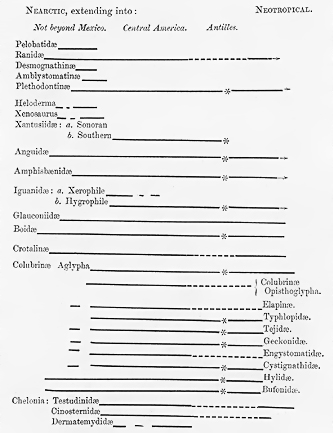 dispersal so far as America is concerned. Those which have sent forms into the Greater Antilles are also indicated. The Greater Antilles have received their fauna3 from Nearctic [[p. 243]] and from Neotropical groups, of both Amphibia and Reptilia, but no northern group has contributed, unless it had spread well into Central or even into South America (witness the Plethodonta, Anguidæ, Amphisbænidæ, Scincidæ, Xantusiidæ, Aglyphous Colubrinæ, Iguanidæ). All these Nearctic, or Old-Sonoran, groups must have been there in Miocene times. The same age must be assigned to the southern immigrants--the Cystignathidæ, Hylidæ, Bufonidæ, Tejidæ, Typhlopidæ. On the other hand, the following must be considered as decidedly post-Miocene so far as their existence in the present Central America is concerned: from the North the Pelobatidæ, Desmognathinæ, and Amblystomatinæ, none of which extend, southwards, beyond Mexico proper; from the South the Engystomatinæ, Opisthoglypha, Elapinæ, none or few of which go beyond Mexico into the United States. Lastly, the latest arrivals in South America are the Crotalinæ, of which only Lachesis lanceolatus has entered the Lesser Antilles. Ancient Sonorans are Heloderma and Chirotes. The Testudinidæ are also Old Sonorans. Still with fair numbers in Mexico, but ever decreasing southwards through Central into South America. Testudo has arrived in Central and South America too late for the Antilles, but in time for the Galapagos. This indicates that the Caribbean Sea and Gulf of Mexico connection was established before the disappearance of the western extent of Central American land. It is another hint that the Isthmus of Panama is but the last vestige of a former much broader land-connection between the two Continents. Concerning the Colubrine Snakes, they remind us in their dispersal southwards of the Iguanidæ, Anguidæ, and Boidæ. They have gone in detachments. The earliest migrants, when arrived in South America, have developed there, and since, into Opisthoglypha and the Aglypha part 3; and these are now surging back, northwards, post-Antillean. A second lot are the Aglypha part 2, many of which have entered the Antilles. Lastly, the last detachment of northerners passing through Mexico and Central America, too late for the Antilles, but still continuing their southward migration. If I am right in the conclusion that American Colubrinæ gave rise to Opisthoglypha in South America, it follows that Opisthoglypha are not a natural group, those of the Old World, chiefly palæotropical, being an instance of collateral development, convergent, homoplastic, or whatever term may be preferred. [[p. 244]] Unless this conclusion be accepted, we have to resort to violent interpretations. Either complete extinction all over North America, a measure which receives no support from actual distribution; or we must be prepared to assign to the Opisthoglypha a Cretaceous age, as a family not descended from North-American Colubrinæ; or, lastly, if we should insist upon the Opisthoglypha as a natural group, the only explanation would be a land-connection across the Equatorial Atlantic, which with shifting modifications is supposed to have existed from Lower or Mid-Cretaceous into at least the Oligocene epoch. This bridging of the Atlantic is somewhat problematic. For our purposes we can discard the Cretaceous Brazil-Africa connection. Of more concern to periarctic distribution is the Europe-Greenland-North America continuity, which is supposed to have persisted well into the Tertiary period. But there was a third, more direct bridge, although one of a curious and mysterious structure, which by its several advocates is dimly described as composed of a shallow sea interspersed with many islands; or as a solid land-belt; or, lastly, as a long archipelago with a continuous coast. This mysterious structure is supposed to account for the unmistakable similarity between the now extinct Antillean and Mediterranean coral-fauna, Old-World and Antillean land-mollusca, &c. Obviously the corals require sea, the mollusc land. The apparent contradiction may be solved by the suggestion that there existed between Central America and the Mediterranean a sea (part of the Tethys of Suess and Ortmann, later their "Great Mediterranean"), shallow during the Oligocene epoch, studded with islands, bordered by continuous land in the South (Brazilia to West Africa, or later between N. South America and West Africa, part of the Mesozonia of Ortmann) and in the North (Western Europe to Appalachia). Subsequently the Tethys increased to a big "bay" in Mid-Atlantic, this bay extending, spreading south and north, drowning first the southern land-belt, driving the northern land farther and farther north, with the ultimate result of a junction of the South with the North Atlantic; in other words, establishment of the whole Atlantic. Now these land-bridges, provided they existed long enough and at the right time and place, the Southern until at least the beginning of the Eocene, the Northern at least through the Oligocene epoch, would explain many a puzzle in geographical distribution; for instance, that of the Aglossa, Boas, Podocnemis, Amphisbænidæ, Solenodon. The Northern bridge would throw light upon the Anguidæ and upon Spelerpes, a large American genus with a solitary species in Sardinia and Italy. But this is at present a land of dreams. With more claim to reality, we can conclude that Central America, although genetically part of the North-American continent, has received its dominant, most characteristic fauna from South America, and this southern fauna has surged northwards chiefly to the east and west of the Mexican plateau. _________________________