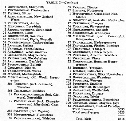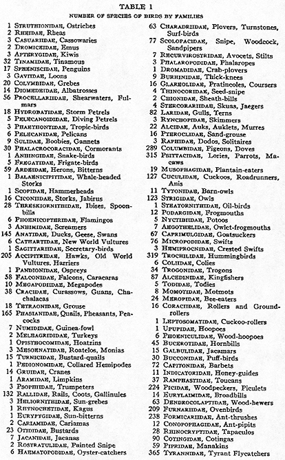 In the tenth edition of the 'Systema Naturae' (1758), the first work in which the species concept is consistently applied, Linnaeus enumerates 564 species of birds, known to him from all parts of the world. In the subsequent 150 years a number of additional counts were published, each one to be quickly superseded by a newer one. The last of these counts is contained in the fifth and final volume of Sharpe's 'Handlist' (1909). The number admitted by Sharpe was 2,810 genera and 18,937 species. This figure, however, includes not only the fossil species, but also treats all subspecies as full species. It is, therefore, obvious that the actual number of species of birds must be considerably below Sharpe's figure, even though about 400 additional good species have been described since 1909. In 1935 I [[p. 65]] made a careful estimate and arrived at the figure 8,500 (Mayr, 1935). Other recent authors have made estimates which vary from 10,000 (Stresemann) to 16,000. It is obviously desirable to replace these rough estimates by an accurate count. Most helpful in this count were the recent standard works on bird taxonomy, such as Peters's 'Check-list of the Birds of the World' and Hellmayr's 'Catalogue of Birds of the Americas.' However, these works were not followed blindly, and modifications were made wherever more recent revisions were available or where an examination of the material led me to different conclusions. In most cases these changes consisted in reducing to the status of subspecies allopatric forms regarded as full species by the earlier authors. As far as the Old World families are concerned, the subsequently listed counts are based directly on the collections of the American Museum which were rearranged during the past ten years by Dr. J. P. Chapin and myself with the help of Messrs. J. Delacour, H. Birckhead, D. Amadon, M. Moynihan, and C. Vaurie. This involved the complete revision of many families, the results of which have been published only in part. Mr. C. K. Nichols had the kindness to count for me the species in the following American families: Dendrocolaptidae, Furnariidae, Formicariidae, Conopophagidae, Rhinocryptidae, Cotingidae, Pipridae, Tyrannidae, Oxyruncidae, and Phytotomidae. The principal difficulty one has to face during a count of the species of birds in the world is to decide, in the case of the many borderline forms, whether to consider them species or subspecies. I was guided in my decisions by the modern biological species concept which does not require morphological intergradation between geographical races, but only the probability of interbreeding. To list a doubtful form as a species, if it is really only a subspecies, is considered by me just as serious an error as to list a form as a subspecies, which really deserves species rank. If anything, I have erred on the conservative side. The final count will probably be lower than mine by about 100 species. The sequence of families follows Wetmore (1940) in the non-Passeres, but follows in the Passeres a system which was developed by the members of the staff of the Department of Birds at the American Museum (R. C. Murphy, J. T. Zimmer, E. Mayr, J. P. Chapin, and J. Delacour) for use in the new synoptic exhibits of the Museum. This system follows closely the generally adopted classifications of Sharpe's 'Handlist' and other standard works. It places the primitive babbler-thrush group near the beginning and the oriole-corvid- [[p. 66]]