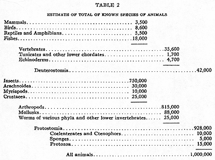 bird of paradise group near the end. Portmann's recent work on the brain of the Corvidae supports this sequence. The reduction of the tenth primary is not considered by us as decisive a character, as it is by some other recent authors. The total figure of 8,616 species is surprisingly close to my previous estimate. I judge that the figure is probably within five per cent, and certainly within ten per cent, of the final figure. The least accurate figures are those for the woodpeckers, larks, warblers, titmice, and finches. Whatever changes may occur in the future will be due primarily to taxonomic revaluations, that is to shifts from specific to subspecies status and vice versa. The period of new discoveries is practically at its end. I doubt that in the entire world even as many as 100 new species remain to be discovered. Only twenty-three families contain 100 or more species. These are the Muscicapidae sensu lato (1360) [with the subfamilies Turdinae 304, Timaliinae 261, Sylviinae 386, Muscicapinae 328], [[p. 68]] Fringillidae (426), Tyrannidae (365), Trochilidae (319), Psittacidae (315), Columbidae (289), Ploceidae (263), Formicariidae (238), Picidae (224), Furnariidae (209), Accipitridae (205), Thraupidae (197), Phasianidae (165), Meliphagidae (160), Anatidae (145), Rallidae (132), Cuculidae (127), Strigidae (123), Pycnonotidae (109), Parulidae (109), Nectariniidae (106), Sturnidae (103), and Corvidae (100). On the other hand, among the total of 160 recognized families there are sixty-six families with less than ten species. The total for the non-Passeres is 3,523 species and that of the Passeres 5,093 species. About seventy-five per cent of these species of birds are polytypic, that is they are composed of more than one subspecies; consequently the number of subspecies of birds is considerably higher than the number of species. I estimate that the number of valid subspecies of birds described by the end of 1945 amounted to about 28,500. This figure is increasing annually by about 200. To give an estimate of the number of genera is very difficult in view of the current revolution of the generic concept. Ten years ago I estimated that about 2,600 genera of birds were recognized (Mayr, 1935). This amounts to about 3.3 species per genus. In recent revisions of the Pycnonotidae, Anatidae, Sturnidae, and Corvidae, Delacour, Mayr, and Amadon recognize an average of 4.75 species per genus. If this average were consistent it would result in the recognition of only 1,800 genera for the known 8,616 species of birds. Even so, birds are much more finely split generically than, for example, most groups of insects or plants. A comparison of the number of species of birds with that of other groups of animals is appended. These figures are based in part on Hesse's (1929) tabulation, but utilize more recent data in several groups (for example, Smart, 1940). In the vertebrates only full species are counted; the figures are therefore much lower than those given in contemporary textbooks which do not distinguish between species and subspecies. The grand total for all animals was deliberately rounded to one million, by adjusting the estimates of various classes, to indicate that the figures are estimates and not actual counts. The disparity of the share the insects have in the grand total (75 per cent) is likely to get worse as time goes on. With new species of insects still being described even from our back yards, and with only an infinitesimal proportion of the tropical insects known, the frequently-made statement that only ten per cent of the species of insects are known, may be well-founded. [[p. 69]]