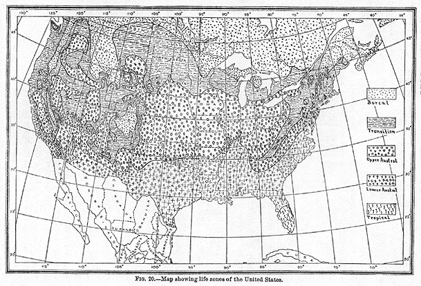 the oriole, bluebird, catbird, thrasher, chewink and wood thrush live in or near the haunts of the hermit and Wilson's thrushes, solitary vireo, bobolink, red squirrel, jumping mouse, chipmunk, and star-nosed [[p. 211]] mole. In this zone we enter the true agricultural part of our country, where apples (Oldberg, Baldwin, Greening, wealthy, seek-no-farther, and others), blue plums, cherries, white potatoes, barley, and oats attain their highest perfection. (5) The Carolinian Zone covers the larger part of the Middle States except the mountains; on the Atlantic coast it reaches from near the mouth of Chesapeake Bay to southern Connecticut, and pushes still farther north in the valleys of the Hudson and Connecticut rivers. It is the region in which the sassafras, tulip tree, hackberry, sweet gum, and persimmon first make their appearance, together with the opossum, gray fox, fox squirrel, cardinal bird, Carolina wren, tufted tit, gnat-catcher, and yellow-breasted chat. In this zone the Ben Davis and winesap apples, the peach, apricot, quince, sweet potato, tobacco, and the hardier grapes (such as the Concord, Catawba, and Isabella) thrive best. (6) The Austroriparian Zone covers the greater part of the South Atlantic and Gulf States, beginning at the mouth of Chesapeake Bay. The long-leafed pine, magnolia, and live oak are common on uplands, and the bald cypress and cane in swamps. Here the mocking bird, painted bunting, red-cockaded woodpecker, and chuck-wills-widow are characteristic birds, and the cotton rats, rice-field rats, wood rats, little spotted skunks, and free-tailed bats are common mammals. This is the zone of the cotton plant, sugar cane, rice, pecan, and peanut; of the oriental pears (Le Conte and Kieffer), the Scuppernong grape, and of the citrus fruits--the orange, lemon, lime, and shaddock. In its western continuation (the Lower Sonoran) the raisin grape, olive, and almond are among the most important agricultural products, and the fig ripens several crops each year. (7) The Tropical Region, within the United States, is restricted to southern Florida, extreme southeast Texas (along the lower Rio Grande and Gulf coast), and the valley of the lower Colorado River in Arizona and California. Among the tropical trees that grow in southern Florida are the royal palm, Jamaica dogwood, manchineel, mahogany, and mangrove; and among the birds may be mentioned the white-crowned pigeon, Zenaida dove, quail doves, a Bahaman vireo, Bahama honey-creeper, and caracara eagle. The banana, cocoanut, date palm, pine-apple, mango, and cherimoyer thrive in this belt. Fundamental Principles of Animal and Plant Distribution. It now remains to discuss the causes of distribution, or rather the causes, other than absolute geographical barriers, that restrict species to definite areas or belts.9 The fact has been long recognized--since the time of Humboldt at least--that animals and plants are not universally distributed over the earth, but disappear along certain more or less definite lines, which lines indicate a change in temperature uncongenial [[p. 212]] to the species; but exactly what temperatures exert the controlling influence, and how they can be measured, have only recently been discovered. Until the past year the mistake was made of assembling all the temperature data in accordance with a single hypothetical law. Then a radically different plan was tried: The temperature data were platted in accordance with two widely different principles--one with reference to the northern, the other the southern, boundaries of the zones. This departure was suggested by a somewhat tardy recognition of the fundamental facts of distribution discovered in 1889, namely, that animals and plants are themselves distributed from two directions--Boreal species from the north, and Austral species from the south. It seemed reasonable to infer, therefore, that northward distribution should be governed by one set of temperatures, and southward distribution by another. The temperature selected as probably fixing the limit of northward distribution is the sum of effective heat for the entire season of growth and reproduction, for it has been proved experimentally and long recognized by phenologists that many species of plants require a definite sum total of heat in order to successfully perform the several vital functions of leafing, blossoming, and fruiting, and that such plants can not mature their seeds until a particular sum of heat is attained. Since plants are unaffected by temperatures below and immediately above the freezing point, a minimum of 6 C. or 43 F. was assumed to represent the inception of the period of physiological activity in spring, and hence was used as a starting point in adding the normal daily temperatures for the entire period in question. Beginning at 43 F., all mean daily temperatures in excess of this were added together, the end of the period in fall being the time when the temperature fell to the same initial point. In this way it became possible to ascertain the total quantity of heat required for each species experimented upon. When the sums of the positive temperatures for a large number of localities in the United States were platted on a large scale map it was found that isotherms (lines showing an equal quantity of heat) could be drawn that correspond almost exactly with the northern boundaries of the several zones. In the case of the southern boundaries a greater difficulty was encountered, for no data had been published bearing on the temperature control of southward distribution. At the same time it seemed evident, from data previously collected by the division, that species are limited in their southward distribution by the mean temperature of a brief period during the hottest part of the summer. For experimental purposes the mean normal temperature of the hottest six consecutive weeks of summer was assumed to be the factor desired, and this temperature was platted for a large 