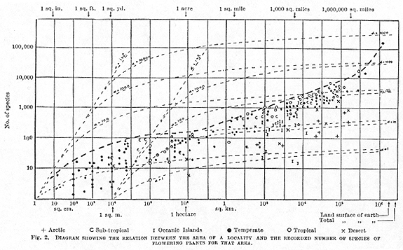 from this the vertical lines represent 1/10, 1/100, etc., of a square kilometre until we reach 1 square centimetre on the extreme left. Moving to the right, we have vertical lines representing 10, 100, 1,000, etc., square kilometres until the one at the right overpasses the total area of the earth's surface. The horizontal lines represent 1, 10, 100, etc., species found in the areas under discussion. Each point on the diagram represents an actual area of land from which the number of species of flowering plants has been recorded. It was not possible to reproduce here a diagram sufficiently large for each point to be identified to its exact location, so instead they have been distinguished into the chief climatic regions with separate indications of oceanic islands and deserts. The points are not quite evenly distributed throughout the range of the diagram: there is a particular lack of records of areas between two acres and a square mile; and I have only been able to find estimates of the total flora for two continents, North America and Europe. There is a lack of records for small areas both from the tropics and in the arctic and sub-arctic climates. Many records could not be used because the exact limits of the area were not well defined. In general there is probably a tendency to underestimate the number of species; but, except in a few areas that have been very little studied, the number likely to be added will make very little difference to the position of the record on the logarithmic scale. An increase of 10 per cent in the number of species will only move the point upward through approximately its own diameter. Superimposed on the diagram by dotted lines