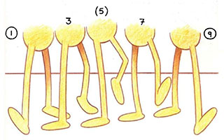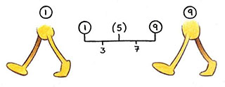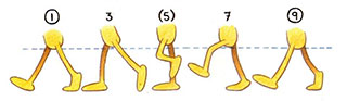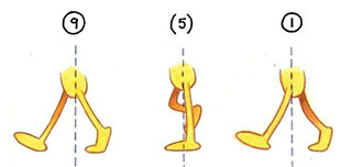 - The cycle is completed by inbetweening 9 back to 1. All positions аге identical to those of 3, (5), and 7, but this time the left foot is the free-leg foot.