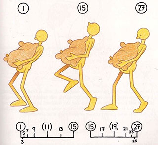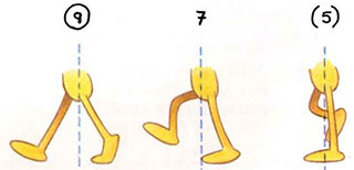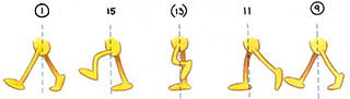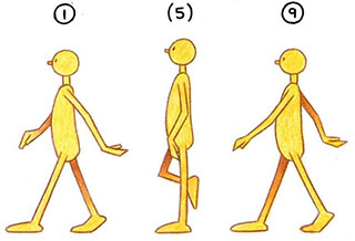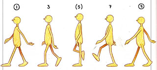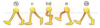 - To complete the movement, the next step must be animated—from drawing 9 to drawing 17. This time the other foot is the one being lifted up, brought through, and put down ahead of the body.