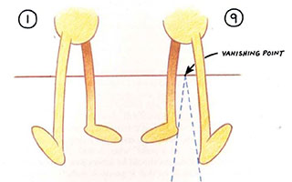 - Notice how a point оп the heel of each foot follows а line of perspective, which converges on the vanishing point on the horizon. If the walk is to be effective, any slip of the contact leg between the two key positions must follow this line of perspective. With this in mind, apply the same principles as you would for the profile walk to get the passing position: