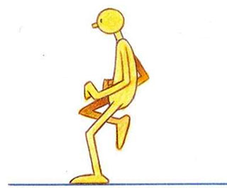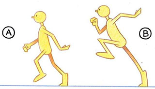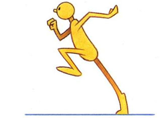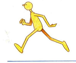 - Obviously drawing В is more dynamic. It is stronger, has direction, апа shows that the character really knows where he is going. The first is weak and uncoordinated; it looks more like a stumbling, exhausted marathon runner at the end of a race than a purposeful, explosive sprinter. The way the key positions in a run are drawn says everything about the type of run. Look at drawing B again. It’s worth noting that in a run—unlike a walk—the body weight is way ahead, out of balance with the contact foot. This communicates that the character either has to get the other foot beneath him fast or he will fall flat on his face. Here, then, is another secret of a good run—constantly avoiding a fall by rushing the feet through beneath the body weight. Generally, the faster the run, the greater the lean. The next key position in the run is the equivalent of the stride position in the walk. In a run, however, this is the point where there is no contact with the ground. The drive from the contact foot causes the body to rise, while the free leg is moving through quickly to contact the ground. The stride position in a run may therefore appear like this: