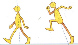 - It all depends on what the running figure has to contend with. With any run, however, the contact foot drives the character up and forward far more than is necessary on any walk. Therefore, the key position has to be dynamic. In other words, the driving-off position must have thrust and direction. Consider these two drawings as an example of a sprinter's action.