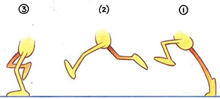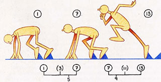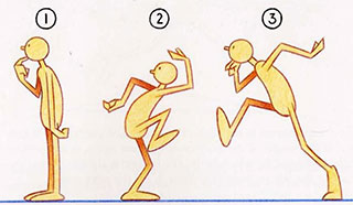 - This is often seen in Disney or Warner Brothers cartoons, where the main character sees another character and speeds off after him. You always see a static pose (1), followed by a wind-up anticipation (2), and then a fast scurry, or run (3), out of shot. Actually, if the anticipation is convincing enough, you can dispense with the run stage altogether and just pop the character off the picture. This effect can be further enhanced if objects in the background are sucked out of shot in the wake of the off-screen character. But remember that the anticipation must be convincing to the audience. For the anticipation to be effective in this case, the character must keep his eyes set in exactly the direction in which he intends to run. If he does not do this, the audience will not know what he has in mind before he disappears. A perfect example of anticipation in action is a sprinter at the starting blocks. Note that as he is in the set position, and the gun goes off, he moves back slightly before moving forward on “go.”