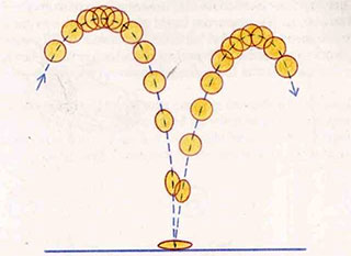 - Note how the ball tends to squash when it hits the ground—losing its round shape—then elongates as it springs up and forward. These movements are quite fast (because of the speed and momentum of the descending ball), but the movement tends to slow considerably as the ball reaches the | highest position. At this high point, the ball reestablishes its normal shape—perfectly round—before descending again, and distorting slightly once more, due to the drag caused by its acceleration. | With a much lighter ball—perhaps a ping-pong ball—the action differs.
