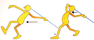 - Experienced javelin coaches always emphasize that there is more to javelin throwing than just running and throwing. Apart from the fast run up, they emphasize that at the end of the run the feet should be planted in a solid, steady position with the hips driven forward and the javelin arm held well back. From this powerful hip position, the throw unwinds from a series of movements, which bear a strong resemblance to the whip action from the center to the upper tip of an archery bow. The body arches from the hip and the shoulder moves forward, ahead of the body. Then the elbow moves forward, to be followed by the wrist. Finally, the javelin is released, with the fingertips following through at the last moment. This is a perfect example of a successive breaking of joints.