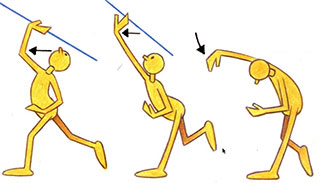 - Flexibility of the joints is essential to good animation. Stiffness is the hallmark of poor animation technique. The more flexibility that can be put into an animated movement (without the character actually looking like rubber), the more convincing it will be. A favorite phrase of older animators 1s “successive breaking of joints.” Quite simply, this means that, as in overlapping action, not all parts of the action move at the same time; instead, a succession of movements takes place in any action. This is particularly true of the human body. | When contemplating an action, the animator must first ascertain which body part is leading the action and which part is following through. A classic example of this can be seen in the javelin thrower.