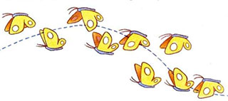 - The animator can, of course, vary the amount of up and down from drawing to drawing. Indeed, a butterfly’s action is distinguished by its erratic flight path. Butterflies appear to flit and dance all over the place, although they usually seem to be headed in one general direction. The golden rule when animating butterflies is that—because of the extreme lightness of their bodies—whenever the wings flap down, the body moves up dramatically, and whenever the wings flap up, the body moves down dramatically.