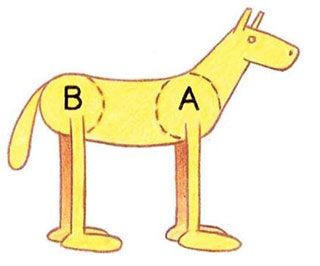 - To get the horse to move, first animate the front legs (A) as in the human walk, at the speed and in the manner you want them to go. Then repeat the same thing with the back legs (B). Make sure, however, that the ground covered by the back legs is the same as that covered by the front legs; otherwise, the body will seem to stretch apart, or fold up like an accordion (which might be amusing, if done consciously). All the rules about up-anddown movement of the body apply, of course. When walking four legs together, it is also necessary to ascertain how the action of the front legs will synchronize with the action of the back legs. A brief look at Muybridge's photographs of a moving horse shows that, essentially, when the front right leg is forward, the back right leg is back | (position 1) and when the front right leg is back, the back right leg 15 forward. Of course, this is an oversimplification of what is going on, but, for cartoon purposes, it is a good starting point.